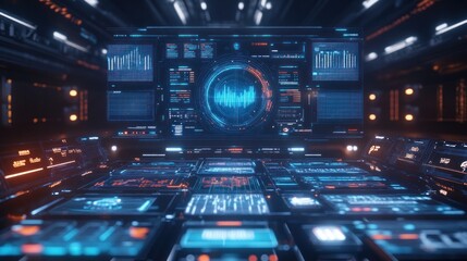 digital holographic interface with data charts and graphs on a blue background, futuristic and informative layout.