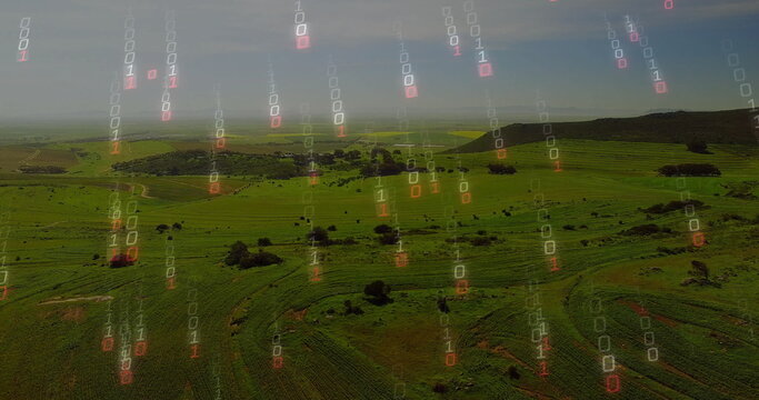 Showing aerial farmland with crop rows unfolding over rolling hills, with binary code overlay