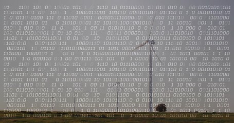 Standing tall wind turbine towering grassland near shrubs, with binary code across sky, copy space