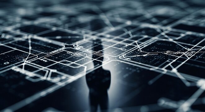 Futuristic digital matrix shows falling green code in cyberspace at night. Digital code elements float in dark space. Matrix style graphic abstract, evokes sense of high tech. Image ideal for tech,