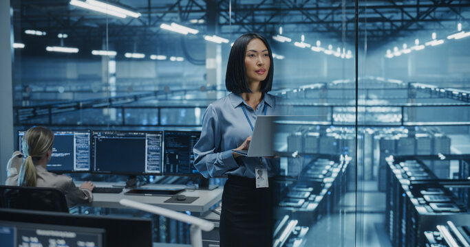 Asian Software Developer Analyze System Performance Metrics on a Laptop Inside a Modern Data Center. Young Female Manager Ensuring Efficient Operations for Critical Infrastructure