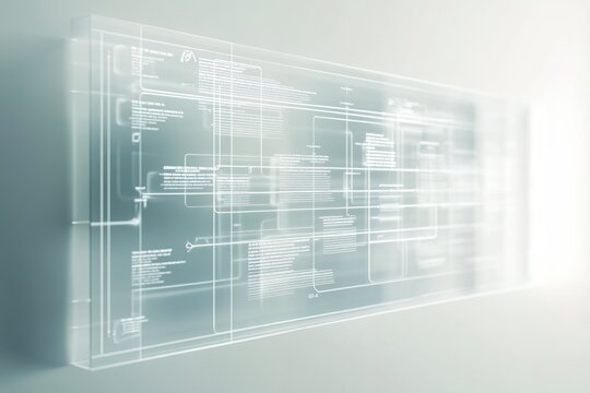 Abstract digital data visualization on a transparent screen, showcasing interconnected information flows and code snippets.