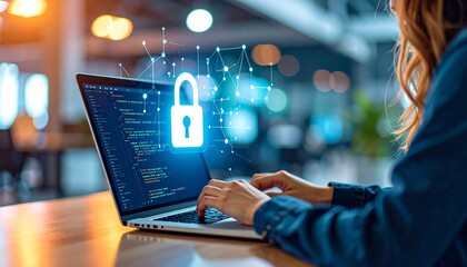 Cybersecurity technology concept with glowing shield and lock graphic over laptop keyboard, symbolizing data protection against cyber attacks.