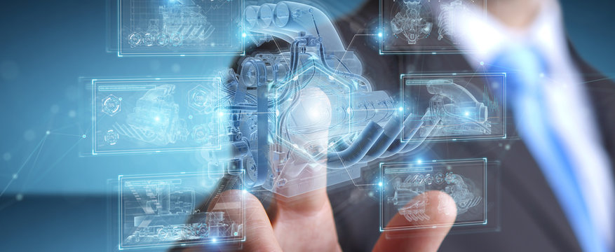 Businessman holding and touching wireframe holographic digital projection of an engine 3D rendering