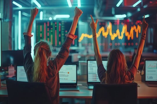 Celebrating success in data analytics office environment digital visualization modern workspace teamwork concept