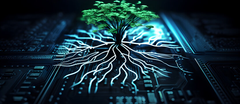 Green tree grows on blue circuit board, roots spread, technology meets nature, digital and organic combined