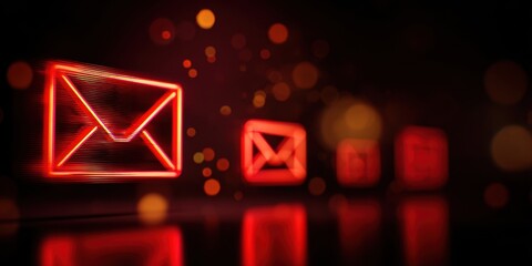 Abstract glowing blue email envelope icons floating in a dark space with light trails, concept for digital communication, electronic messaging and secure data transfer