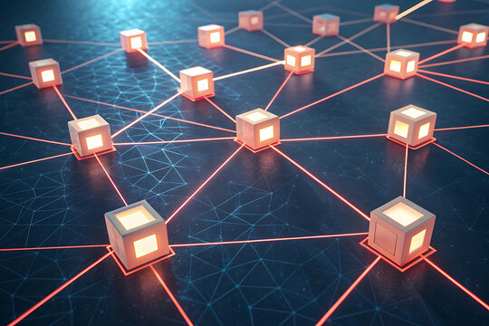 Futuristic data flow with glowing line connecting platforms and document style icons above them