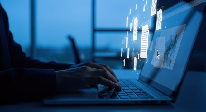 Typing hands over laptop, digital documents float. Window in background