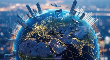 Conceptual globe with skyscrapers and data visualization, representing global connectivity and technology.
