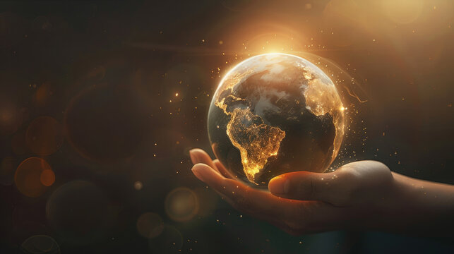 A hand is holding a globe with a light shining on it. The globe is surrounded by a blurry background, giving the impression of a glowing, illuminated planet. Concept of wonder and awe at the beauty