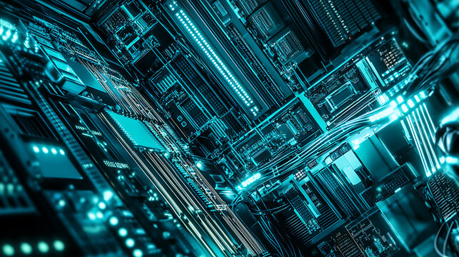 Server rack interior, cooling, data center,  glowing components