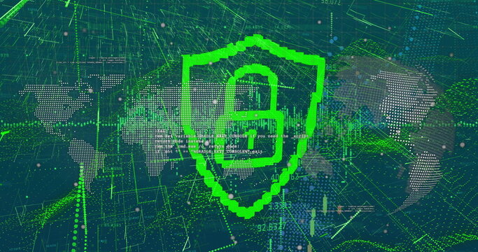 Image of data processing and padlock over dark background