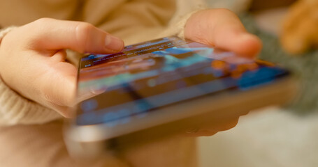 Female professional scrolling through social media content, navigating digital platform with focused thumb movements while sitting comfortably at home