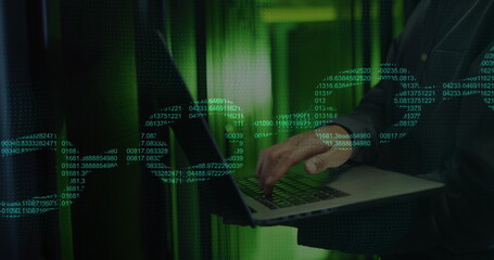 Image of chain and data processing over male it engineer using laptop by computer servers