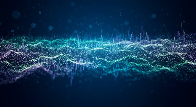 Abstract digital waves in green, blue, and teal on gradient dark background