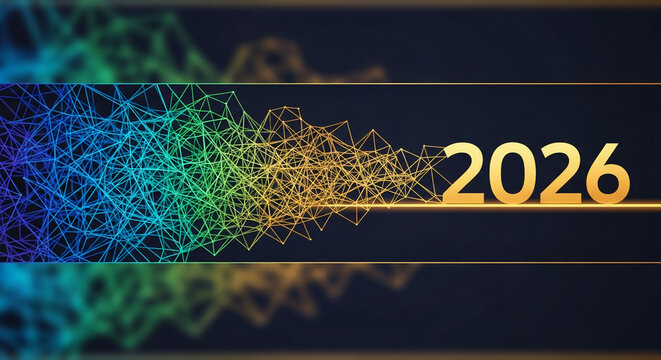 Digital illustration of connected lines forming mesh and number 2026 in gold color on dark background, symbolizing future trends and network connection