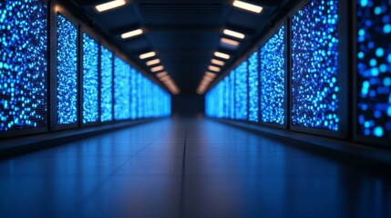 Futuristic server room with glowing blue LED lights, data storage technology, cybersecurity infrastructure, digital network concept