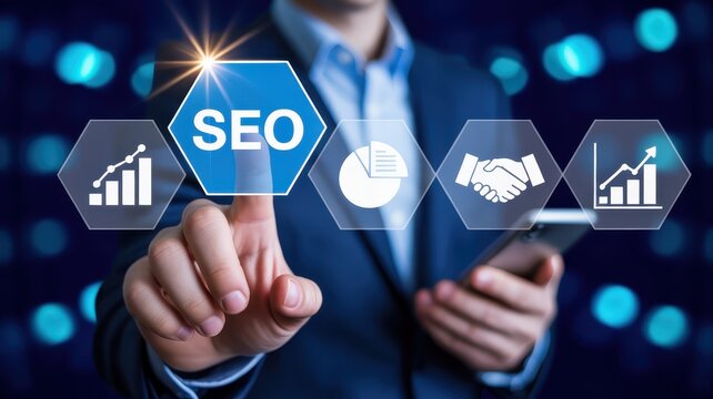 Abstract blue hexagonal grid displaying glowing technology icons representing connectivity and digital data flow