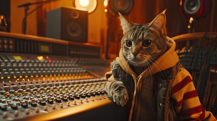 cat sound engineer working at record music studio, animal musician sitting with professional audio mixer console