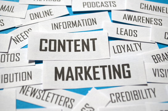 content inspire marketing text quote on wooden signpost outdoors in nature during blue hour.