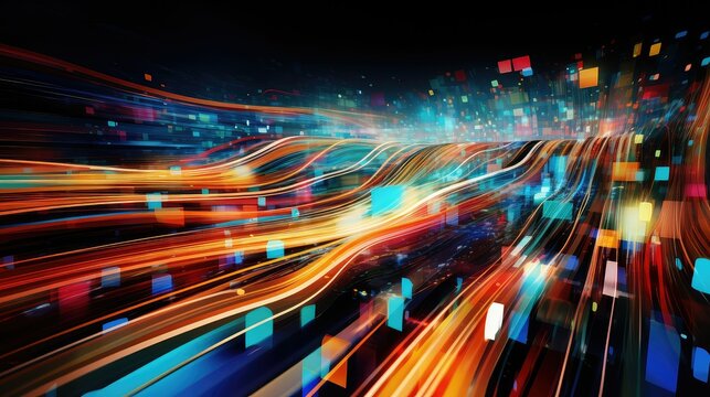 Zoomed-in perspective of neon light trails converging at center on dark background, symbolizing fast movement and digital convergence