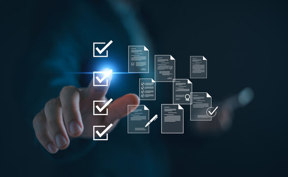Electronic smart checklist and document on virtual screens concept, business people check electronic documents on digital documents, paperless offices,working on borderless communication technology