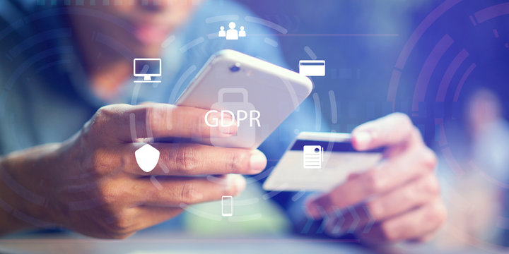 close up asian working man using smartphone mobile and make payment with credit card at home office with virtual interface of GDPR (General Data Protection Regulation ) , privacy personal data concept