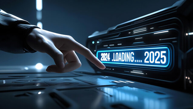 Finger points to futuristic progress bar indicating the year 2025