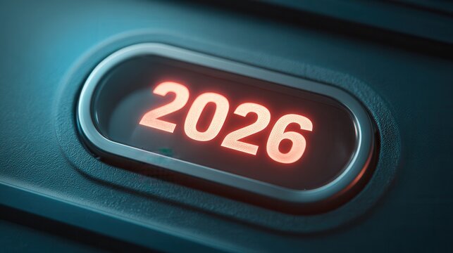 Futuristic LED digits display “2026” in bright blue on a sleek, high-tech metallic interface with glowing accents.