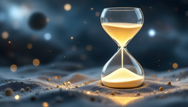Glowing digital hourglass measuring flowing time on a futuristic background. Futuristic hourglass made of glass, glowing led-like background, abstract scene symbolizing time and technology.