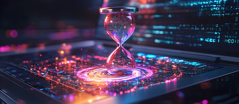 Futuristic Digital Hourglass Hologram with Glowing Sand and Countdown Display Concept