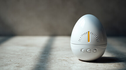 An egg-shaped timer against a blurred gray background, showcasing a modern and minimalistic design. The sleek white timer features a dial and buttons