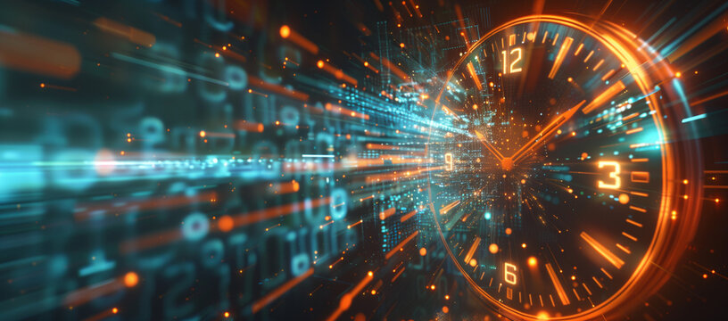 Abstract futuristic speed time background with digital clock and data flow hologram, cyber technology concept.