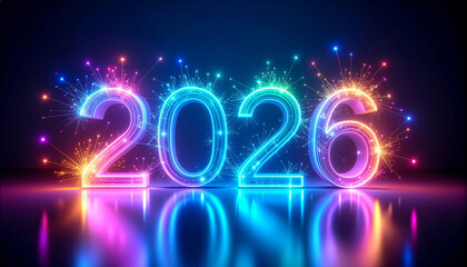 Vibrant neon 2026 numbers glowing with colorful fireworks and light bursts on a dark futuristic background. Perfect for New Year celebration, innovation, technology, countdown, and holiday design them