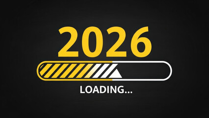 Minimalist graphic of year 2026 with yellow progress bar and loading text on dark background as concept for time passing and upcoming celebration