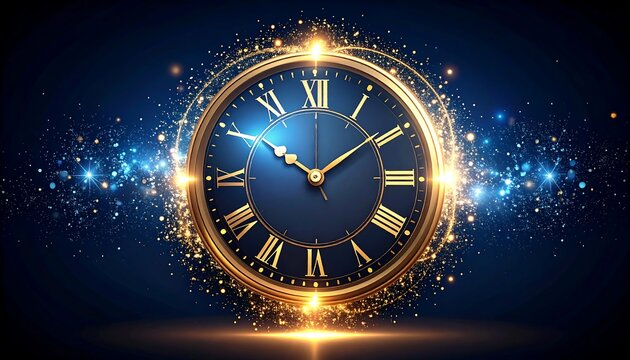 Golden clock face, glowing with a dynamic effect,  a night-blue background