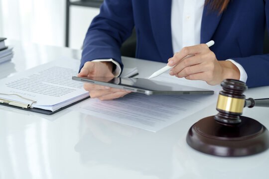 Lawyer working legal data contract at workplace..