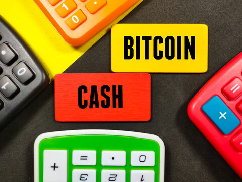 Business concept.Text BITCOIN CASH writing on notebook with calculator on a yellow and black background.