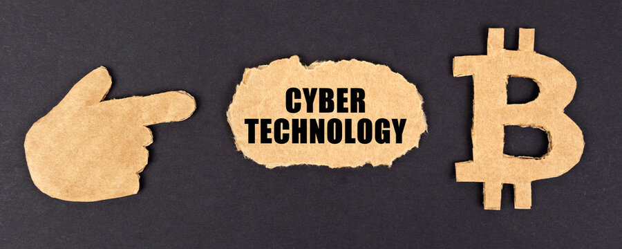 On a black background, cardboard figurines of bitcoins, a hand and a sign with the inscription - Cyber technology