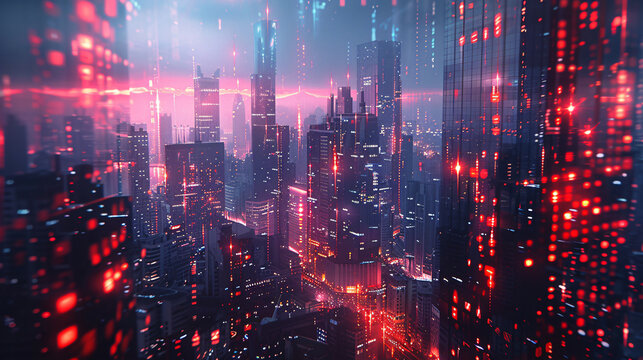 Futuristic Cityscape with Integrated Digital Stock Market Data Overlay