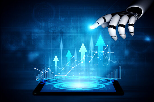 A robotic hand reaches towards a digital tablet showcasing upward financial graphs, symbolizing the intersection of technology and market growth in modern business. Scalp
