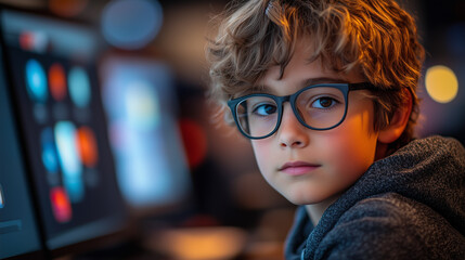 A young boy participating in a digital workshop on how to identify fake news, with interactive exercises and visual cues guiding his learning.