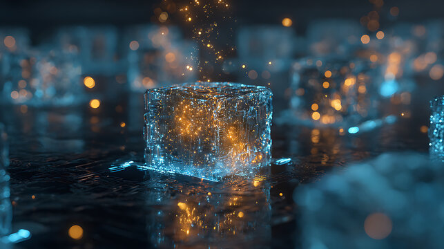 Abstract digital chain with blue glowing metal links shines bright. Orange sparks fly around strong secure connection. Illustration shows futuristic data network tech concept. Blockchain, modern