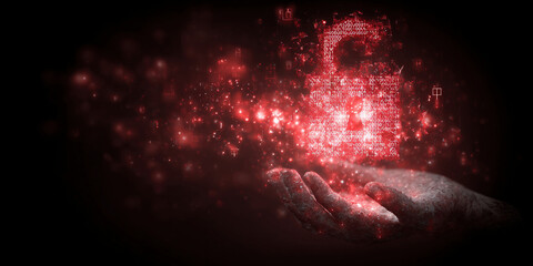 Cybersecurity digital data protection concept with gowing red shield and secur padlock symbol representig online safety firewall ecryption and internet privcy technology