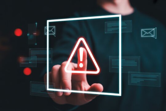 A human hand holds a glowing red system warning sign, a futuristic concept of cybersecurity alerts and digital threats.