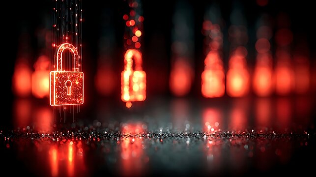 Cybersecurity lock glowing red with digital particles securing data and network protection