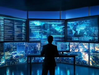 Cybersecurity Expert Analyzing Threat Data on Multiple Screens in Dark Room