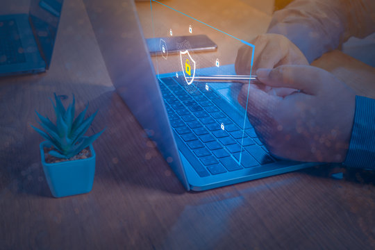 Businessman using a laptop computer with technology cybersecurity and privacy concept. protection and safe data for global network security.