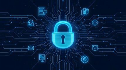 Cybersecurity concept with digital lock symbol on glowing shield, representing data protection, online security measures, and encryption technology in modern networks.